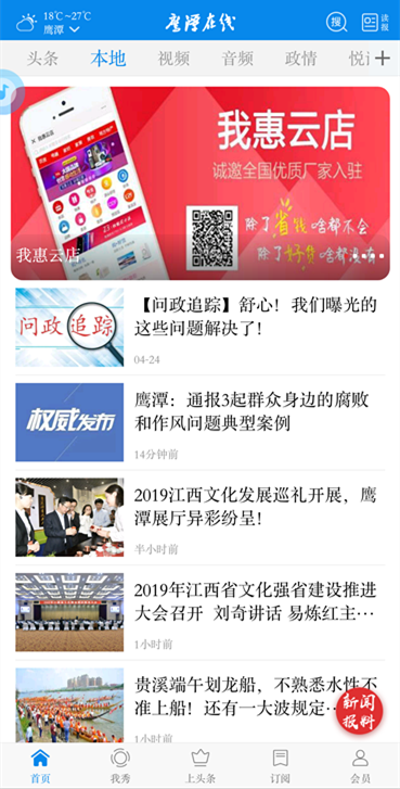 除了移动客户端进入过场时出现的“我惠云店”宣传大图,“鹰潭在线”新闻网首页子栏目“本地”板块的置顶轮播图中,同样可以找到我们的身影。